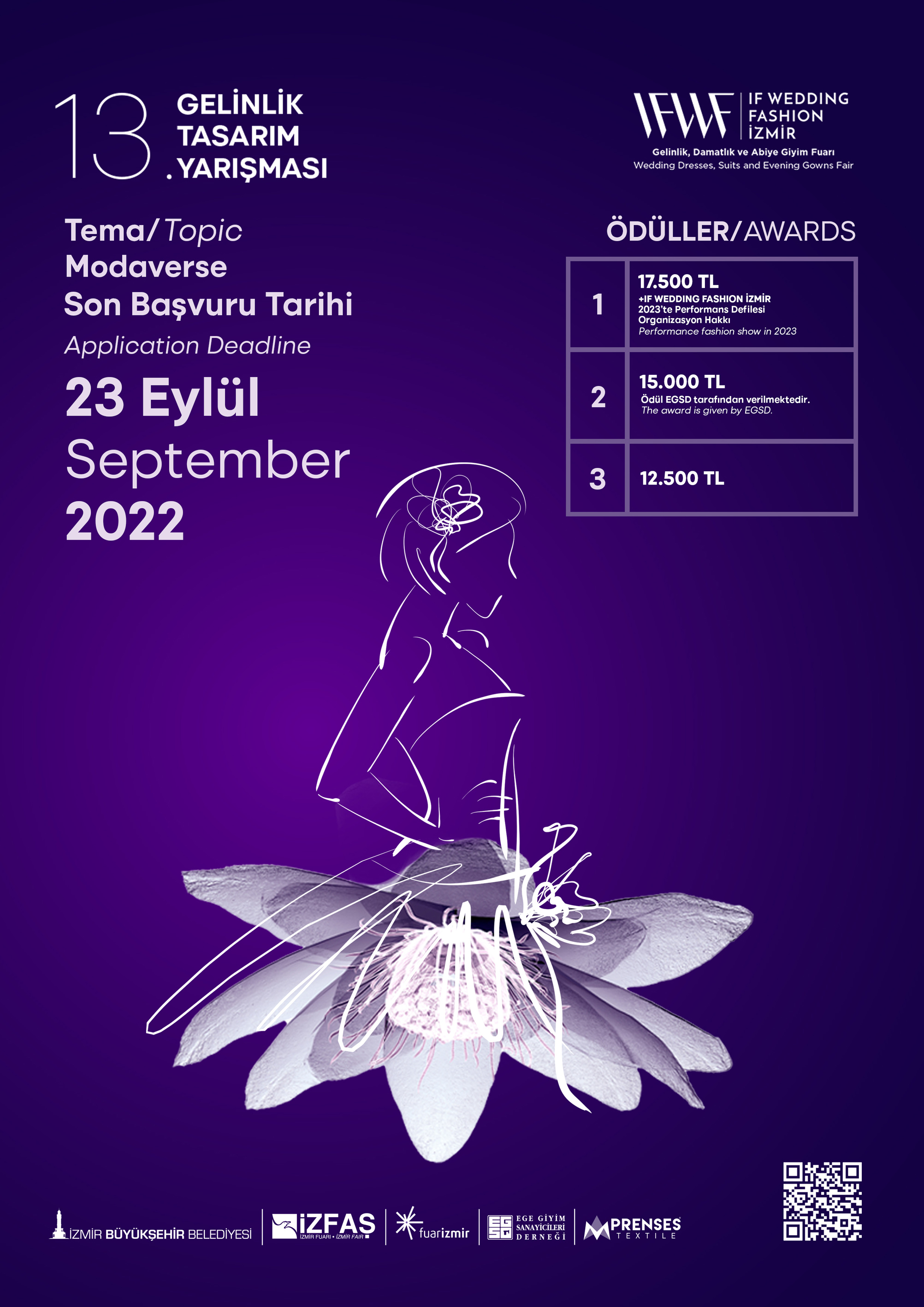 Geçmiş ile geleceği birleştiren, geleneksel modanın izlerini taşıyan yeniçağın tasarımların ortaya çıkması amacıyla “Modaverse” temasıyla düzenlenen yarışmaya başvurular, 23 Eylül 2022 saat 17.00’ye kadar devam edecek ve ön eleme ise 30 Eylül 2022’de yapılacak. 3 Ekim günü yarı finalistler ilan edilip finale kalan tasarımcılar, İzmirli moda ve tasarımcıların atölyelerinde sektör profesyonellerinin mentörlüğünde dikim sürecine başlayacak. Genç yetenekler, 22 Kasım 2022 günü gerçekleşecek açılış töreni defilesinde tasarımlarını profesyonellere sunma şansı yakalarken yarışma ödülleri de sahiplerini bulacak. Yarışmayla ilgili bilgi almak için katılımcılar, https://ifwedding.izfas.com.tr/tasarim-yarismalari-13.-gelinlik-tasarim-yarismasi adresini ziyaret edebilir.