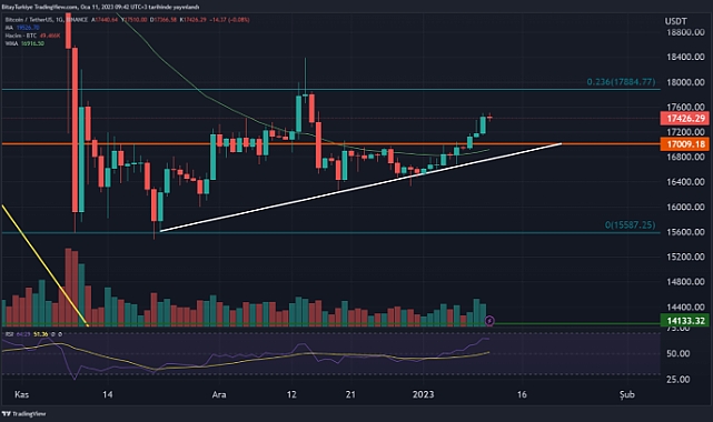 Bitcoin yükseliş hareketine yeni yılın onuncu gününde de devam etti. 17510$ seviyelerine kadar yükselip ret alan Bitcoin gün içerisinde 17420$ seviyelerinde fiyatlanıyor. Günlük kapanışını 17250$ üzerinde yapması pozitif gözüküyor. Yukarı yönlü hareketliliğin devamında ilk direnç seviyesi 17530$ olarak karşımıza çıkıyor. Bu seviyenin aşılması ve kalıcılık sağlaması halinde 17800$ seviyelerine kadar yükselişi beraberinde getirebilir.