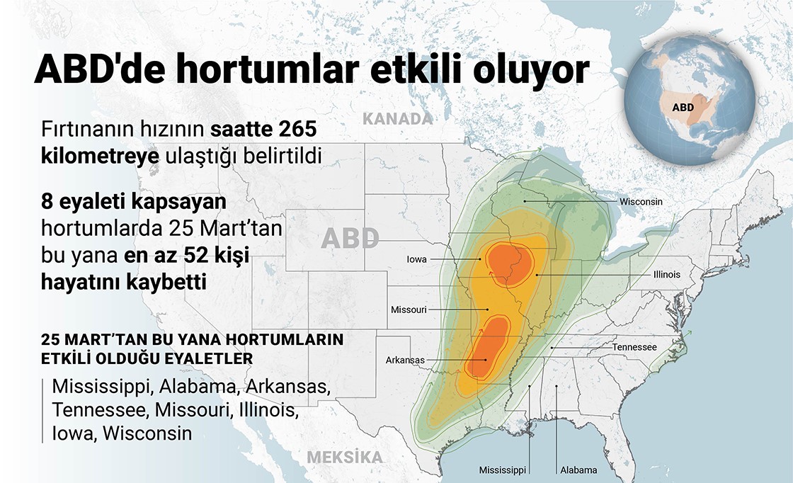 Fırtınanın hızının saatte 265 kilometreye ulaştığı belirtildi. 8 eyaleti kapsayan hortumlarda 25 Mart’tan bu yana en az 52 kişi hayatını kaybetti.