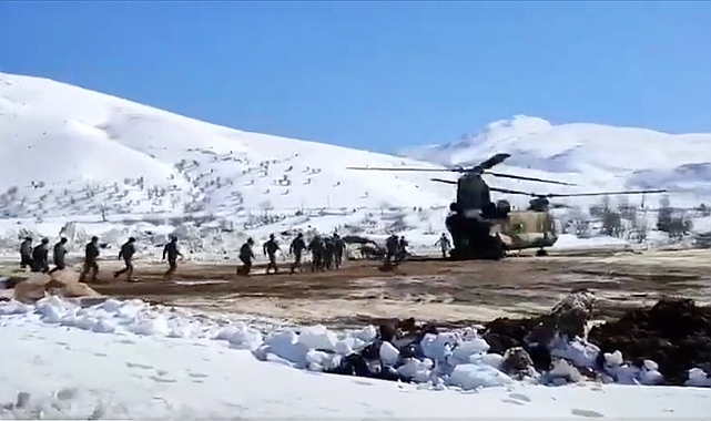 Kahramanmaraş merkezli depremlerden etkilenen Adıyaman'ın köylerine yardım malzemeleri, Kara Kuvvetleri Komutanlığına ait helikopterlerle ulaştırılıyor.