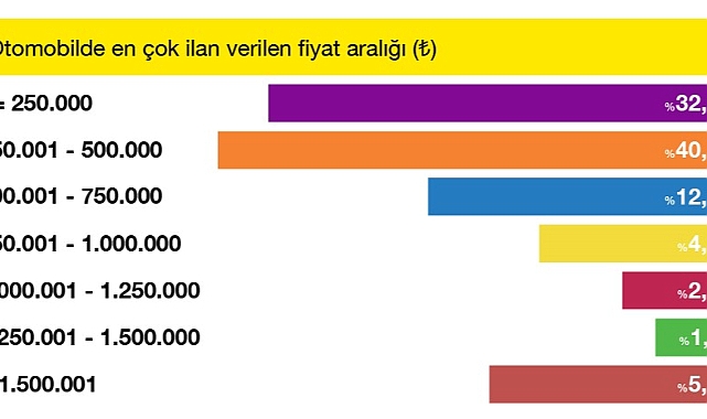 Tüm ilanların %26’sını 200.001 – 300.000 km aralığındaki araç ilanları oluşturdu. Fiyatlara baktığımızda ise 250.0001- 500.000 TL aralığı %40,8 ile en çok ilan yayınlanan fiyat aralığı oldu.