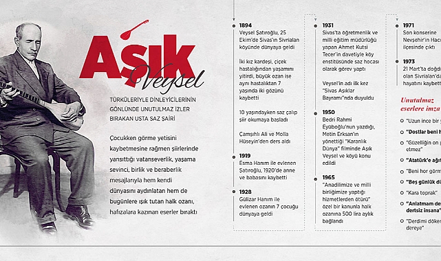 Uzun ince bir yoldayım/Gidiyorum gündüz gece/Bilmiyorum ne haldeyim/Gidiyorum gündüz gece’ dizeleriyle hafızalara kazınan ünlü halk ozanı Aşık Veysel Satıroğlu'nun vefatının üzerinden 50 yıl geçti.Aşıklık geleneğinin en büyük temsilcilerinden Veysel, 25 Ekim 1894'te dünyaya geldi, çocukluğunu ve gençlik yıllarını Sivrialan'da geçirdi.