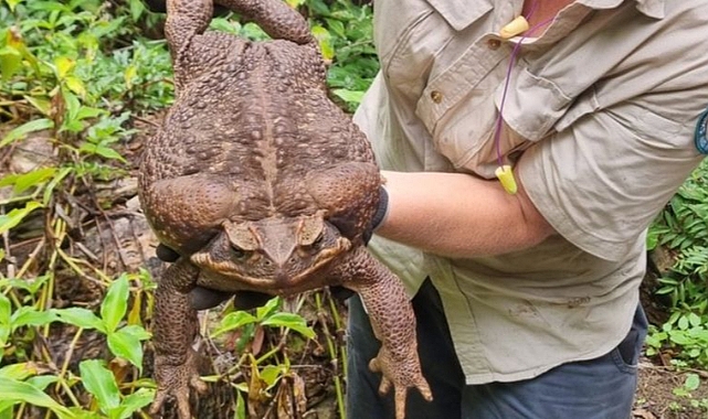 Queensland'de doğal yaşam devriyesi Kylee Gray, dev kurbağayı ilk gördüğünde gözlerine inanamadı:
