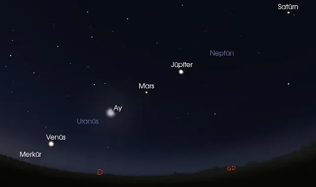 Birkaç gün boyunca çıplak gözle de takip edilebilecek bu olay gezegenlerin geçit töreni olarak tanımlanıyor.Dün akşam Güneş’in batmasının ardından gökyüzünde görülebilen bu sıralama açık bir havada ve şehir ışıklarından uzakta daha net bir şekilde seçilebiliyor.Geçen yaz Merkür, Venüs, Mars, Jüpiter ve Satürn nadir rastlanan bir gezegen kavuşumunda bir araya gelmişti.Eğer akşamın ilk saatlerinde gökyüzüne bakmadıysanız hızlıca ufukta kayboldukları için Merkür ve Jüpiter’I yakalama şansını kaçırmış olabilirsiniz.NASA'da görevli astronom Bill Cooke, bu gezegenlerin sıralandığını görmek için Dünya'nın herhangi bir yerinde gün batımından hemen sonra ufkun batısına bakmak gerektiğini dile getirdi.İngiltere'deki Greenwich Kraliyet Gözlemevi'nden astronom Jake Foster ise bu tarz hizalanmaların bizim Dünya’daki bakış açımıza özgü olduğunu, “Bu gezegenler şu an gerçekten de sıralanmış değil, Güneş Sistemi’ne dağılmış durumdalar. Ancak nadir de olsa bir arada görmemizi sağlayacak kadar gökyüzünde yakınlaşıyorlar” dedi.