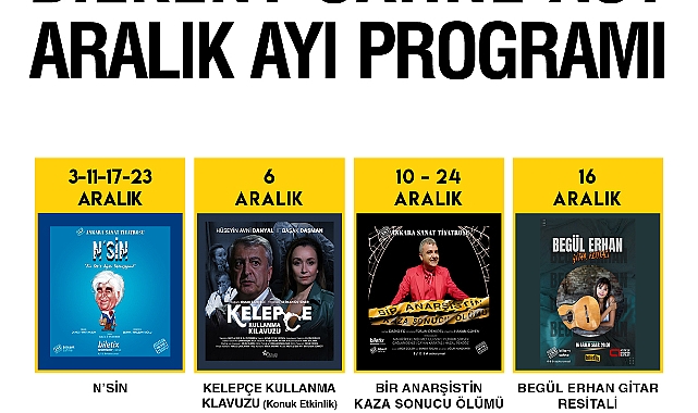 Bilkent Sahne AST, Aralık ayında da perdelerini birbirinden ünlü oyuncular ve çok değerli tiyatro eserleri ile aralıyor. 3, 11, 17 ve 23 Aralık tarihlerinde Deniz Fırat Aksoy'un gerçek bir hikâyeden yola çıkarak uyarladığı ve Serhat Nalbantoğlu'nun yönettiği "N'SİN" tiyatro severlerle bir araya gelecek. Oyun, Aziz Nesin'in 4 Temmuz 1965'te Moskova'dan dönüşünde polis tarafından gözaltına alınmasını ve akabinde gelişen olayları izleyiciye mizahi bir dille sahneye aktarıyor. 60 yıl sonra bile değişmeyen düzeni hicveden oyun, Ankara Sanat Tiyatrosu prodüksiyonu ile Ekim ayında buluşan "N'SİN", tiyatro severleri güldürürken aynı zamanda dün ile bugün arasındaki bağı gözler önüne serecek.6 Aralık’ta ise Hüseyin Avni Danyal ve Başak Daşman’ı buluşturan konuk etkinlik “Kelepçe Kullanma Kılavuzu” Bilkent Sahne AST’ta olacak. Hiçbir şeyin göründüğü gibi olmadığı bu sorguda oldukça zeki ve entelektüel bir kadın, pek de zeki olmayan inatçı bir polisin karşısında kendinden emin, göz altı süresinin bitmesini beklerken polis sadece teşkilattan ve çalışma hayatından kurtulmak derdinde. 16 Aralık’ta ise Begül Erhan’ın Gitar Resitali saat 16.00’da Bilkent Sahne AST’ta olacak.Nobel ödüllü yazarın oyunu usta oyuncularla sahnede10 ve 24 Aralık tarihlerinde ise Nobel ödüllü İtalyan yazar Dario Fo tarafından yazılmış; Mahir İpek, Mehmet Ulusoy, Yıldırım Şimşek gibi usta oyuncuların kadrosunda yer aldığı, iki perdelik tiyatro oyunu “Bir Anarşistin Kaza Sonucu Ölümü’’ Bilkent Sahne AST’ta tiyatro severlerle bir araya gelecek. Saat 20.00’de sahnelenecek oyunda; Mehmet Ulusoy, Mahir İpek, Çağlar Deniz, Yıldırım Şimşek ve Hazal Pekgöz izleyicinin karşısında olacak.29 Aralık saat 19.30’da konuk etkinlik olarak Onur Öztürk’ün Gitar Resitali Bilkent Sahne AST’ta sanat severlere unutulmaz anlar yaşatacak.