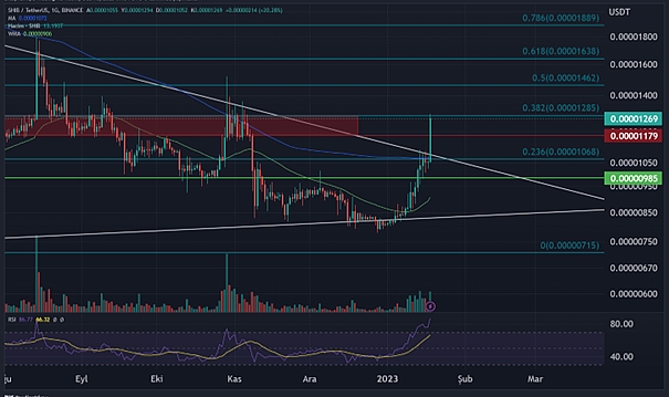 Lider kripto para Bitcoin oldukça kritik direnç seviyesi olan 21.600$ seviyesinden ret alarak gün içerisinde 21.250$ seviyelerinde fiyatlanıyor. Hızlı yükselişlerin ardından şimdilik akümüle olan Bitcoin için, yukarı yönlü hareketlilik olması halinde ilk kritik direnç seviyesi olarak 21.600$ tekrar test edilebilir. Bu seviyenin üzerinde günlük kapanışlar yapması 23.230$ seviyelerine kadar bir yükselişi beraberinde getirebilir. Aşağı yönlü hareketlilikte ise ilk destek seviyesi olarak 20.450$ seviyesinin çalışması beklenebilir. Bu seviyeye tutunamaması halinde 19.550$ seviyelerini beraberinde getirebilir.SHIB TEKNİK ANALİZ