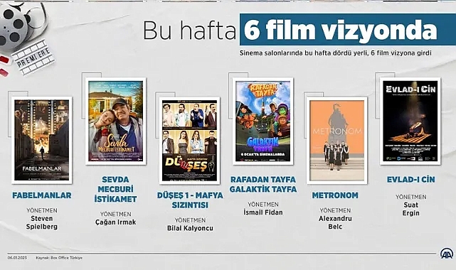 Sinema salonlarında bu hafta dördü yerli, 6 film vizyona girecek. Steven Spielberg'in ve Çağan Irmak'ın yeni filmleri dikkati çekiyor. İşte izleyicilerle buluşacak yeni yapımlar...SEVDA MECBURİ İSTİKAMETÇağan Irmak'ın yönettiği "Sevda Mecburi İstikamet", ünlü bir oyuncunun kızıyla olan yarım kalmış hikayesini tamamlamak için çıktığı yolculuğu beyaz perdeye taşıyacak.Selçuk Yöntem ve Selin Şekerci'nin başrollerini paylaştığı filmde ikiliye Kubilay Aka, Elif Ceren Balıkçı, Günay Karacaoğlu, Şebnem Sönmez ve Nergis Öztürk eşlik ediyor.Mirsad Heroviç'in görüntü yönetmenliğini yaptığı filmin müzikleri müzisyen Teoman'ın imzasını taşıyor.FABELMANLARSteven Spielberg'in kendi çocukluğundan izler taşıyan filmi "Fabelmanlar", II. Dünya Savaşı sonrasında, Arizona'da mütevazı bir ailede büyüyen Sammy Fabelman'ın, sinemanın büyüsüyle aile içerisinde yaşanan gelgitlerin üstesinden gelmeye çalışmasını konu ediyor.Senaryosunu Spielberg ile Tony Kushner'in kaleme aldığı filmin başrollerinde Michelle Williams, Paul Dano, Seth Rogen, Gabriel LaBelle ve Julia Butters oynadı.METRONOMAlexandru Belc'in yönettiği "Metronom", 1972 yılının Romanya'sında, genç bir kadının ülkeden kaçacağını öğrendiği erkek arkadaşıyla birlikte geçirdiği son birkaç günü anlatıyor.Dram sahneleriyle öne çıkan Fransa ve Romanya ortak yapımı filmde, Mara Bugarin, Serban Lazarovici ve Vlad Ivanov rol aldı.RAFADAN TAYFA GALAKTİK TAYFAİsmail Fidan tarafından yönetilen "Rafadan Tayfa Galaktik Tayfa", haftanın animasyon filmi olarak beyaz perdede yerini alacak.DÜŞEŞ 1 - MAFYA SIZINTISIHayrettin Onur Gökoğuz, Korhan Herduran, Ceyda Ateş ve Ufuk Özkan'ın başrollerinde oynadığı "Düşeş 1-Mafya Sızıntısı", yerli komedi meraklılarının ilgisini çekmeye aday.Bilal Kalyoncu'nun yönetmenliğini üstlendiği yapım, karıştıkları suçun kefareti olarak, emniyetin operasyon düzenleyeceği bir mafyaya sızmak zorunda kalan iki arkadaşın hikayesini anlatıyor.EVLAD-I CİNBerna Gülen, Serhat Şentürk ve Yavuz Gürbüz'ün rol aldığı, Suat Ergin'in yönettiği "Evlad-ı Cin", bir cin tarafından evlat edinilen bir çocuğun hikayesini işliyor.