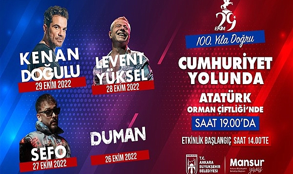 29 Ekim Cumhuriyet Bayramı kutlamaları kapsamında ünlü sanatçı ve müzik grupları 4 gün boyunca Başkentte sahne alacak.“100. Yıla Doğru Cumhuriyet Yolunda” etkinlikleri 26 Ekim Çarşamba günü gerçekleşecek Duman konseriyle başlayacak. 27 Ekim Perşembe günü Sefo, 28 Ekim Cuma günü Levent Yüksel konserleriyle devam edecek kutlamalar, 29 Ekim Cumartesi günü Kenan Doğulu’nun vereceği konser ile taçlanacak. Sevilen sanatçılar, Gazi Mustafa Kemal Atatürk’ün mirası olan Atatürk Orman Çiftliği’nde hayranlarıyla buluşacak.Alternatif sahnedeki etkinlikler 26 Ekim Çarşamba günü 14.00’te başlayıp, son güne kadar sürecek. Ana sahnede programları ise saat 18.00’de “Cumhuriyet Yolunda” tiyatral gösterisiyle başlayacak, DJ performanslarıyla devam edecek.Atatürk Orman Çiftliği’nde gerçekleşecek etkinliklere katılmak isteyen Ankaralıların ulaşım sıkıntısı çekmemeleri amacıyla; 26-29 Ekim tarihleri arasında 12.00 ile 23.00 saatleri arasında Kızılay Zafer Çarşısı önünden konser alanına ring seferleri düzenlenecek.