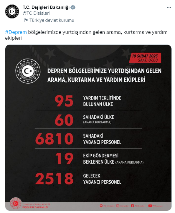 Dışişleri Bakanlığı'nın sosyal medya hesabından yapılan paylaşım şöyle:"Deprem bölgelerimizde yurtdışından gelen arama, kurtarma ve yardım ekipleri; 95 yardım teklifinde bulunan ülke, 60 sahadaki ülke(arama kurtarma), 6 bin 810 saadaki yabancı personel, 19 ekip göndermesi beklenen ülke(arama kurtarma), 2 bin 518 gelecek yabancı personel"