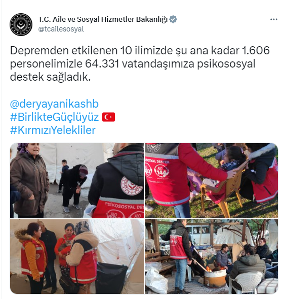 Bakanlıktan yapılan açıklamada şöyle denildi:"Depremden etkilenen 10 ilimizde şu ana kadar bin 606 personelimizle 64 bin 331 vatandaşımıza psikososyal destek sağladık."