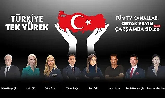 Başta Kahramanmaraş ve Hatay olmak üzere Adıyaman, Gaziantep, Adana, Osmaniye, Malatya, Diyarbakır, Şanlıurfa, Kilis’i etkileyen depremlerin yıkıcı sonuçlarını yaşayan vatandaşlarımız için Türkiye’nin tek yürek olacağı canlı yayın tüm kanallarda aynı anda ekranlara gelecek. Nihat Hatipoğlu, Pelin Çift, Çağla Şıkel, Tümer Doğru, Nazlı Çelik, Acun Ilıcalı, Deniz Bayramoğlu, Didem Arslan Yılmaz moderatörlüğünde yapılacak ortak yayında sanat, iş ve spor dünyasının önde gelen isimleri ve halk depremzedelere destek olacak. 15 Şubat Çarşamba akşamı saat 20.00’de başlayacak “Türkiye Tek Yürek” yardım kampanyasında sevilen dizi ve program yüzlerinin toplayacağı yardımlar AFAD ve Kızılay’a bağışlanacak.
