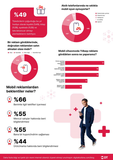 Digital Turbine’nin araştırması markaların bu dönemde hedef kitlelerine nasıl ulaşacağına ilişkin de önemli ipuçlarını içeriyor. Araştırmaya katılan kullanıcıların yüzde 66’sı yılbaşı döneminde sanılanın aksine mobil cihazlarında karşılarına çıkan çevrimiçi reklamların kendileriyle ilgili teklif içermesini istiyor. Ankete katılan kullanıcıların yüzde 55’i reklamların kendilerine mevcut fırsatları gösterip kupon ve ya indirim sağlamasını bekliyor. Tüketicilerin yüzde 58'inin yılbaşı döneminde mobil cihazlarında gördükleri reklamlardan sonra alışveriş yaptıklarını belirtmesi ise mobil reklamların inkar edilemez gücünü bir kez daha kanıtlıyor. Ankete katılanların yüzde 36’sı mobil cihazlarında reklamı gördükten sonra birkaç gün içinde, yüzde 24’ü ise aynı gün ürünü o ürünü satın alıyor.