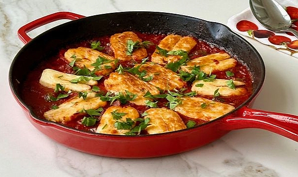 Yapılışı:*Biberleri küp küp doğrayın, sarımsak ve kurutulmuş domatesleri de minik doğrayın. *Doğranmış biber ve zeytinyağını fırına girebilecek tavaya alın, açık ateşte hafifçe yumuşayıncaya kadar soteleyin, sarımsak ve kurutulmuş domatesleri ekleyip sarımsakların kokusu çıkana kadar soteleyip domates sosunu ilave edin, 4 - 5 dakika pişirip ocağı kapatın. Hellim peynirini dilimleyerek domatesli karışımın üzerine sıralayın. Fırının ızgara ayarında hellimler kızarana kadar pişirin. Üzerine maydanoz serpiştirip sıcak olarak servis edin. Kısa bir not:*Hellim çok tuzlu bir peynir olduğundan tuz miktarını kontrollü ayarlayın. Afiyetle, sevgiyle ve sağlıkla kalın...