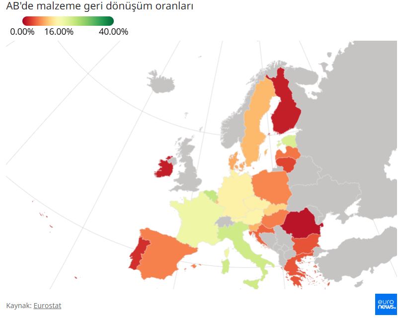 Avrupa Birliği genelinde geri dönüşümde kaydedilen ilerleme son 10 yılda kayda değer olmadı.Eurostat’ın son verilerine göre, 2015–2024 arasında AB genelindeki geri dönüşüm oranı yalnızca bir puan arttı: yüzde 11,2’den yüzde 12,2’ye.Yeni ham madde çıkarımını azaltmaya gelince, Hollanda neredeyse yüzde 33’lük oranıyla tüm ülkeler arasında açık ara öne çıkıyor.Komşu Belçika, yüzde 22,7 ile ikinci sırada; İtalya ise neredeyse yüzde 22 ile üçüncü.Tablonun en altında ise sadece yüzde 1,3 ile Romanya bulunuyor. Onu yüzde 2 ile Finlandiya ve İrlanda izliyor.