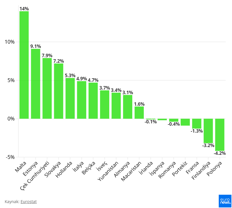 Son 10 yılda altı ülkede geri dönüşüm oranları düşüş gösterdi; özellikle Polonya’da (eksi yüzde 4,2) ve Finlandiya’da (eksi yüzde 3,2) kayda değer gerilemeler yaşandı.Daha yavaş düşüşler ise Fransa (eksi yüzde 1,3), İspanya (eksi yüzde 0,2), İrlanda (eksi yüzde 0,1) ve Romanya (eksi yüzde 0,4) için kaydedildi.Öte yandan Malta, geri dönüştürülen malzemelerde yüzde 14 gibi önemli bir artış gösterdi. Estonya da çok iyi bir performans sergileyerek 2014’ten bu yana yüzde 9 artış kaydetti; onu neredeyse yüzde 8 ile Çekya izledi.Geri dönüştürülen farklı malzeme türleri incelendiğinde, metal cevherleri yüzde 23,4 ile en yüksek döngüsellik oranına sahip. Bunu yüzde 14,3 ile metalik olmayan mineraller izliyor.Sonrasında yüzde 9,9 ile biyokütle, ve yüzde 3,8 ile fosil enerji materyalleri veya taşıyıcıları geliyor.