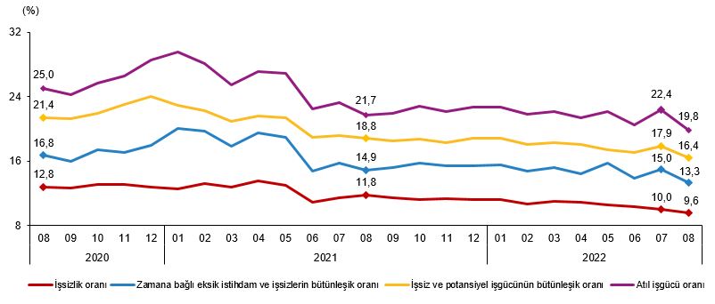 Zamana bağlı eksik istihdam, potansiyel işgücü ve işsizlerden oluşan atıl işgücü oranı 2022 yılı Ağustos ayında bir önceki aya göre 2,6 puan azalarak %19,8 oldu. Zamana bağlı eksik istihdam ve işsizlerin bütünleşik oranı %13,3 iken potansiyel işgücü ve işsizlerin bütünleşik oranı %16,4 olarak tahmin edildi.