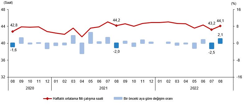 İstihdam edilenlerden referans döneminde işbaşında olanların, mevsim ve takvim etkilerinden arındırılmış haftalık ortalama fiili çalışma süresi 2022 yılı Ağustos ayında bir önceki aya göre 0,9 saat artarak 44,1 saat olarak gerçekleşti.