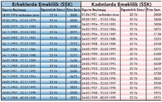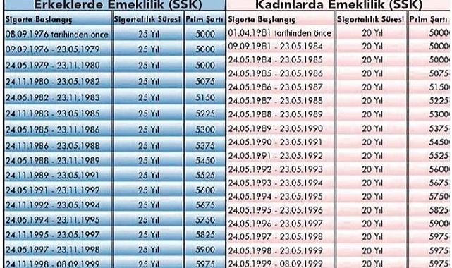 Hizmet süresi şartını tamamlayanlardan, ilk sigortalılık girişi Kasım 1980’e kadar olan erkekler 5 bin prim günüyle emekli olurken, kadınlar da Mayıs 1985 öncesi için aynı primle emekli olabilecek. Bu iki noktadan sonra ise prim sayıları artacak.İşe giriş tarihine göre prim gün şartları 5 bin 75, 5 bin 300, 5 bin 525, gibi rakamlara çıkacak. Son olarak, Kasım 1998 ile EYT’yi doğuran 8 Eylül 1999 tarihli yasa arasında işe girişi olan erkekler için 5 bin 975, Mayıs 1999 ile Eylül 1999 arası işe giren kadınlarda prim şartı 5 bin 975’e ulaşacak. Bağ-Kur ve Emekli Sandığı kapsamındaki kadınlar 7 bin 200, erkekler ise 9 bin prim günüyle yasadan yararlanabilecek.