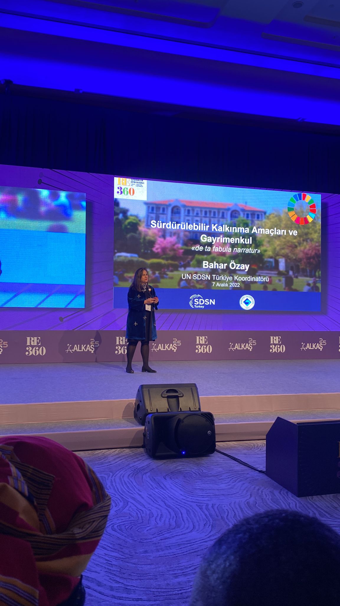 Birleşmiş Milletler Sürdürülebilir Kalkınma Amaçları ve Gayrimenkul Sektörü” başlıklı oturumda konuşan UN SDSN Türkiye Koordinatörü Bahar Özay, önümüzdeki yıllarda küresel sıcaklık artışının artı 4 derecenin üstüne çıkacağı ve dünyanın taşıma kapasitesinin 1 milyarın altına ineceği uyarısını paylaştı. Özay “Bugünden şefkatli, vicdanlı, insan odaklı düşünmek zorundayız aksi takdirde yok olacağız, para getirecek işler yapmanın da bir anlamı kalmayacak.” ifadelerini kullandı.