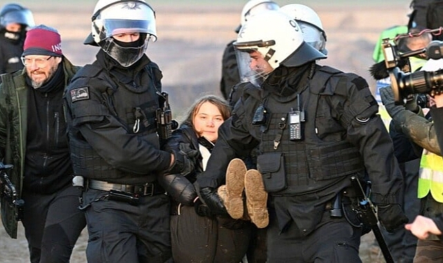 Almanya'nın Kuzey Ren Vestfalya (KRV) eyaletinde "linyit köyü" olarak bilinen Lützerath'ta polisin bölgeden çıkarmaya çalıştığı, maden sahalarının genişletilmesine karşı 2,5 yıldır mücadele eden çevreci aktivistlere destek vermek için gösterilere katılan Thunberg, burada Alman polisi tarafından gözaltına alındı.