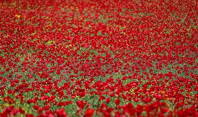 Kahramanmaraş merkezli 6 Şubat'taki depremlerden etkilenen ilçedeki tarlalar, doğada kendiliğinden yetişen gelinciklerin açmasıyla kırmızıya boyandı.