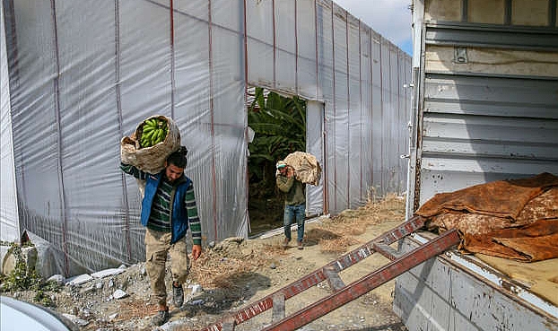 Hataylı çiftçiler deprem nedeniyle tarlada kalan ürünlerini topluyor Son yıllarda muz, limon ve maydanoz üretimiyle adından söz ettiren Hatay'ın Arsuz ilçesinde, çiftçiler, deprem nedeniyle hasat edemedikleri son ürünleri toplamak için yoğun mesai harcıyor. 700 dekarlık kapalı alanda muz üretimi gerçekleştirilen ilçede, üreticiler çalışma yürütüyor.