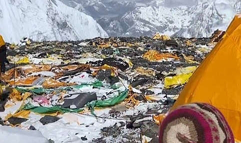 Keşif gezisinden alınan görüntüler, dağcı Luc Boisnard ve ekibinin plastik şişeler, hijyenik pedler ve terk edilmiş çadırlar da dahil olmak üzere atık yığınları arasında güçlükle ilerlediğini gösteriyor.