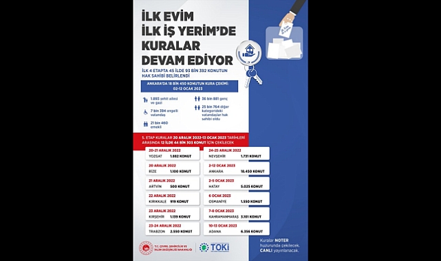 Buna göre, bugün ve yarın Yozgat'ta 1882, bugün Rize'de 1100, yarın Artvin'de 500, 22 Aralık'ta Kırıkkale'de 919, 23 Aralık'ta Kırşehir'de 1139, 23-24 Aralık'ta Trabzon'da 2 bin 550, 24-25 Aralık'ta Nevşehir'de 1731, 2-12 Ocak 2023'te Ankara'da 18 bin 450, 2-5 Ocak 2023'te Hatay'da 5 bin 25 konut, 6 Ocak 2023'te Osmaniye'de 1550, 7-8 Ocak 2023'te Kahramanmaraş'ta 3 bin 101, 10-13 Ocak 2023'te Adana'da 6 bin 356 konut için kura çekilişi yapılacak.