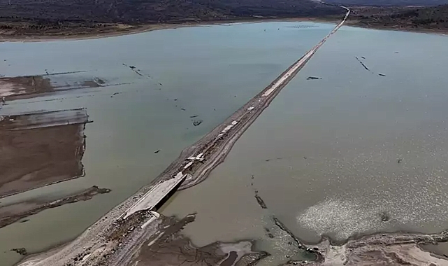 Suların çekilmesiyle yürüyerek geçilebilecek hale gelen eski kara yolu, dronla görüntülendi. Manzara, hem geçmişi hem de kuraklık gerçeğini gözler önüne serdi.