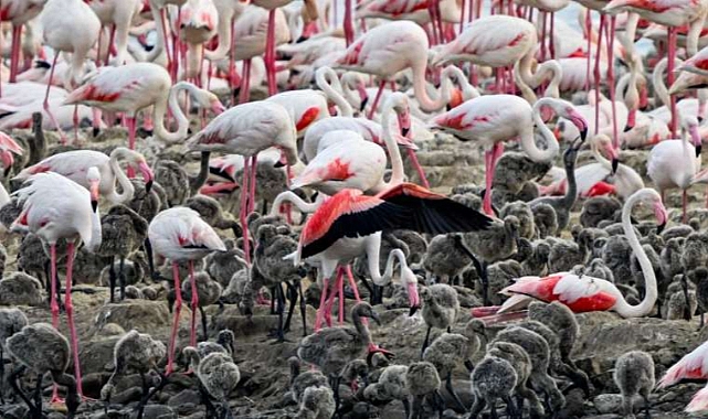 “İzmir Kuş Cenneti" ismiyle de bilinen Gediz Deltası'ndaki yapay kuluçka adasında yavru flamingolarla hareketlilik başladı. UNESCO Dünya Doğa Mirası adayı Gediz Deltası, zengin yaşam kaynaklarıyla aralarında nesli tehlike altında olan canlıların da bulunduğu yüzlerce türe ev sahipliği yapıyor.Türkiye'de flamingoların üreme sahasından biri olan bölge, her mevsim çok sayıda su kuşuna yuva oluyor. Flamingoların bulunduğu Gediz Deltası'nda, mevcut doğal kuluçka adasının dalga erozyonuyla erimesi nedeniyle 2012 yılında oluşturulan 6,5 dönümlük yapay kuluçka adasında her yıl binlerce yavru doğuyor.