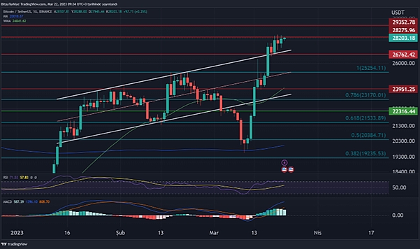 ABD Hazine Bakanı Yellen daha önce yaptığı açıklamalarda banka mevduatları konusunda kapsamlı sigorta sağlamayı düşünmediklerini ifade etmişti, fakat dün mevduatı güvende tutmak için gerekli önlemlerin alınacağını açıklamasıyla birlikte ABD borsalarını destekledi. S&P 500 %0,23 artış gösterirken Nasdaq %1,01 ile günü kapattı. Nasdaq’taki bu yükseliş kripto para piyasasına da yansıdı. Bitcoin dün %3,8 artış gösterirken 28.750$ seviyelerini test etti. Ethereum ise Bitcoin’e nazaran daha iyi bir performansla %4,5 artışla 1.857$ seviyelerine kadar bir yükseliş yaşadı. Bu sabah saatlerinde ise vadeli endeksler ve kriptolara bakıldığında karışık bir görünüm hakim. Dün ayrıca ABD’den işsizlik haklarından yararlanma başvuruları açıklandı. Rakamlar beklentilerin altında gerçekleşti ve banka iflaslarına rağmen işgücü piyasasının güçlü seyir sürdürdüğüne işaret etti. İşgücü piyasasındaki güçlü seyirle birlikte FED’in artışlarına devam edeceği beklentisini desteklenmeye devam etti. Kripto piyasasının toplam değeri dün yaşanan artışla birlikte psikolojik direnç olan 1 trilyon doların üzerinde 1.15 trilyon dolar seviyelerinde hareketlilik gösteriyor. Bitcoin’in dominasyonu %47,3 Ethereum dominasyonu ise %19,2 seviyelerinde yer alıyor. Bugün OMG, MASK, DUSK ve JOE çift haneli kazançlarla Bitay’da en çok yükselen kripto paralar olarak öne çıkıyor.Bugün küresel piyasaların radarında ABD ve Euro Bölgesinden öncü PMI verileri olacak.BITCOIN TEKNİK ANALİZ