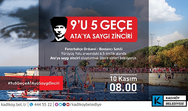 KADIKÖY'DE ATA'YA SAYGI ZİNCİRİ OLUŞTURULACAKKadıköy’de, Cumhuriyet’in kurucusu Ulu Önder Mustafa Kemal Atatürk’ün ebediyete intikalinin 84. yılında, binlerce kişi 10 Kasım’da bir araya gelerek “Ata’ya Saygı Zinciri” oluşturacak. Ata’ya Saygı Zinciri’nde binlerce kişi, saat 9’u 5 geçe Fenerbahçe Orduevi ile Bostancı Sahil yürüyüş yolunda Türk bayrakları ve Atatürk posterleriyle Gazi Mustafa Kemal Atatürk için el ele verecek. 2013 yılından bu yana Kadıköy Belediyesi ve Kadıköy Belediyesi Gönüllüleri tarafından düzenlenen Ata’ya Saygı Zinciri’nde 6,5 kilometrelik insan zinciri oluşturulacak. Anma törenine denizden kanolar, su jetleri ve tekneler 9’u 5 geçe sirenlerini çalarak katılacak ve dalgıçlar denizin altında Atatürk posteri ve Türk bayrağı açacak.
