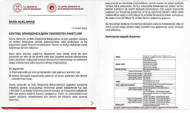 Bakanlıktan yapılan yazılı açıklama şöyle:“Çevre, Şehircilik ve İklim Değişikliği Bakanlığımız ile yeni yapıların inşasına ve kentsel dönüşüme yönelik çalışmalarımızı hızla sürdürüyor ve bu kapsamda uygun finansman imkanlarını Hazine ve Maliye Bakanlığı olarak sağlamaya devam ediyoruz.Daha önce devreye aldığımız desteklere ilave olarak simdi de riskli alanlarda ver alan ya da kendisi riskli olan yapıların kentsel dönüşümüne ilişkin destekler sağlayarak kentsel dönüşümü hızlandırmayı ve muhtemel doğal afetlere karşı daha hazırlıklı olmayı öngörüyoruz.Bu kapsamda;1. Riskli alanlarda yer alan ya da kendisi riskli yapıların malikleri için2. Kentsel dönüşüm kapsamında yüklenici ve konut üreticileri için destek paketleri hazırladık.Çevre, Şehircilik ve İklim Değişikliği Bakanlığımızla eşgüdüm içerisinde maliklere yönelik sunduğumuz finansman paketi kapsamında kişi başı 1 milyon 250 bin TL'ye kadar finansman imkanı sunuyor ve finansman maliyetinin 840 baz puana kadarlık kısmını karşılıyoruz. Paket ile vatandaşlarımızın yasam şartlarını iyileştirmeleri için önemli bir kolaylık daha sunmuş oluyoruz.Ayrıca, Hazine destekli kefalet sistemini de kapsama dahil ederek, kentsel dönüşüm sürecinde yüklenici ve konut üreticisi firmaların uygun koşullarda finansmana erişimini sağlıyoruz. Hazine destekli kefalet sistemi kapsamında şu ana kadar uyguladığımız tazmin oranını bu paket özelinde yüzde 7'den yüzde 9'a çıkarıyoruz. Ayrıca, mevzuatta Bakanlığımıza yetkisi verilen kefalet oranların da azami düzeyde kullanıyoruz. Çok uygun koşullarda sağlanan bu finansman paketimiz ile 12 ay ödemesiz dönem imkanı dahil toplam 48 ay vade ile 250 milyon TL'ye kadar finansman imkanı sunuyoruz. Bu doğrultuda 50 milyar TL kefalet limitini kullanıma açıyoruz.Bu finansman desteklerinin kentsel dönüşüm sürecini hızlandırarak ülke ve millet olarak doğal afetlere daha hazırlıklı hale gelmemize vesile olmasını ümit ediyoruz.”
