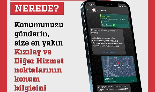Kızılay’dan “Deprem Bölgesinde En Yakın Kızılay Hizmet Noktası Nerede” Uygulaması Kızılay, 11 ilde şiddetli olarak hissedilen 7.6 ve 7.7 büyüklüğündeki iki depremin ardından yaraları sarmaya devam ediyor. Kızılay, afetzedelerin hizmetlere daha hızlı ve kolay ulaşabilmesi için “Deprem bölgesinde en yakın Hizmet Noktası nerede” uygulamasını başlattı. Afetzedeler Kızılay’ın Whatsapp hattına konumlarını göndererek kendilerine en yakın hizmet noktasının konum bilgisine anında ulaşabilecek. Kahramanmaraş’ın Pazarcık ilçesi merkezli ve Elbistan ilçesi merkezli gerçekleşen depremlerin ardından afet bölgesinde iyileştirme çalışmaları devam ediyor. Depreminin ardından bölgede beslenme, temel ihtiyaç maddeleri ve afetzedelere yönelik psikolojik ilk yardım faaliyetleri veren Kızılay, deprem bölgesinde çalışan afetzedelerin bu hizmetlere daha hızlı ve kolay ulaşabilmesinin de yollarını geliştiriyor. Kızılay’ın “Deprem bölgesinde en yakın Hizmet Noktası nerede” başlığı ile kullanıma aldığı