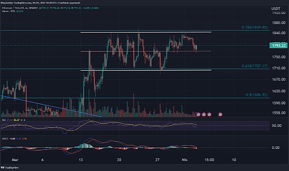 Bitcoin, yeni güne kırmızı mumla başlayarak bu sabah saatlerinde 27900$ seviyelerinde hareketlilik gösteriyor.Uzun süredir yükselen bir kanal içerisinde hareketlilik gösteren Bitcoin gece saatlerinde yaşadığı geri çekilmelerle kanalın alt bandını kırsa da bu sabah saatlerinde tekrar kanala dahil olmuş gözüküyor. Olası yukarı yönlü bir hareketin devam etmesi için 27800$ üzerinde kalıcılık sağlaması önemli olacaktır. Ardından 28285$ oldukça önemli bir direnç seviyesi olarak karşımıza çıkıyor. Bu seviyenin kırılması halinde kanalın orta bandı olan 28840$ seviyelerine kadar bir yükseliş beklenebilir.Olası aşağı yönlü bir harekette ise 27800$ilk destek seviyesi olarak karşımıza çıkıyor. Bu seviyenin kırılması halinde 27520$ ardından da 26760$ seviyelerinin destek olarak çalışması beklenebilir. ETHEREUM TEKNİK ANALİZ