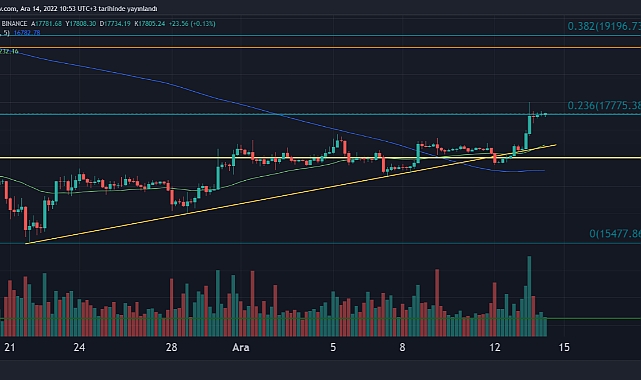 Bitcoin, yaklaşık bir aydır oluşturduğu yükseliş trendini sürdürüyor ve bu zaman zarfında yükseliş %15’lere ulaştı. Dolar bazında aylık %15 getiri bu dönemde oldukça değerli. Özellikle dün açıklanan enflasyon verisi sonrası bu yükseliş daha da hız kazandı ve Bitcoin 18.000$ seviyelerine dokundu. Sabah saatlerinde ise 17.800$ bandında seyreden Bitcoin, akşam saat 22.00’da açıklanacak olan FED kararına ve Powell’in konuşmasına odaklanmış durumda bekleyişini sürdürüyor. Fibonacci 0,236’ya denk gelen 17.775$ seviyelerinin destek görevi görmesi pozitif momentum için uyumlu bir hareketlilik diyebiliriz. FED kararı sonrası volatilite artabilir. Aşağıda 17.000$ destek seviyesi olmaya devam ederken yukarıda 18.900$ önemli bir yatay direnç seviyesi konumunda bulunuyor.