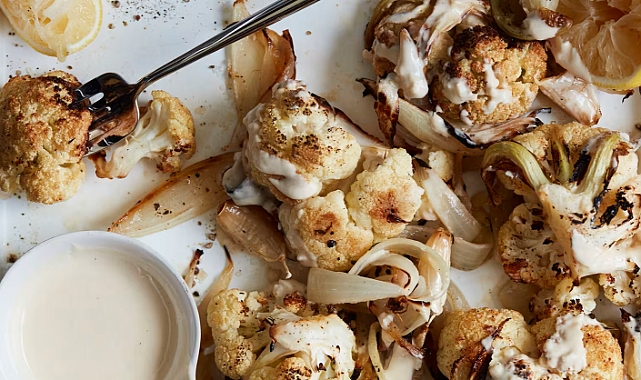 Bu kızarmış karnabaharın daha da lezzetli olması için üzerine tahin, limon, yağ, sarımsak ve tuzdan oluşan bir sos dökün.