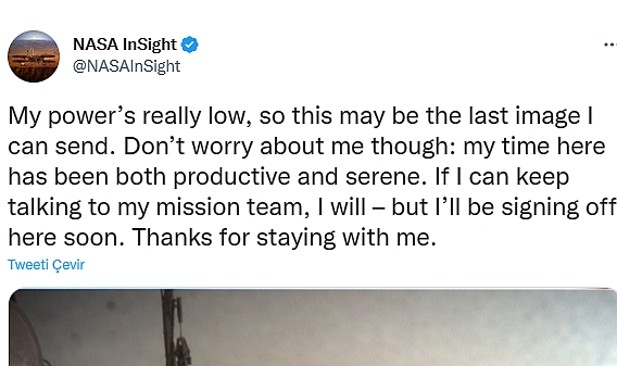 Nasa, 2018 yılında Mars'a inen uzay aracı InSight'ın görevine son vermek üzere. Uzay aracının adına açılan twitter hesabında "Enerjim çok düşük, bu gönderebileceğim son görüntü olabilir. Yine de benim için endişelenmeyin, buradaki zamanım sakin ve verimliydi. Ekibimle konuşmaya devam edebilirsem, konuşacağım ancak yakın zamanda ayrılacağım. Benimle olduğunuz için teşekkürler." yazısıyla birlikte Mars'tan bir görüntü paylaşıldı. Bu görüntü 11 Aralık tarihinde uzay aracının kaydedebildiği son görüntü.