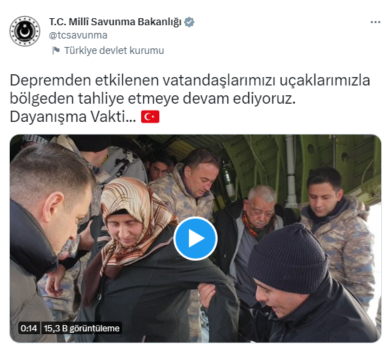 Gündem Yayınlanma: 10 Şubat 2023 - 09:40 MSB: "Vatandaşlarımızı uçaklarımızla bölgeden tahliye etmeye devam ediyoruz" Milli Savunma Bakanlığı(MSB), depremden etkilenen vatandaşları uçaklarla bölgeden tahliye etmeye devam ettiklerini bildirdi. Gündem 10 Şubat 2023 - 09:40 Yorumlar TAKİP ET Yazdır A Büyüt A Küçült Yorumlar MSB'den yapılan açıklama şöyle:"Depremden etkilenen vatandaşlarımızı uçaklarımızla bölgeden tahliye etmeye devam ediyoruz. Dayanışma vakti." # MSB# tahliye# deprem YORUMLAR adlı kullanıcıya cevap x Gönder İlginizi Çekebilir Haftanın En Çok Okunan 5 Haberi Haftanın En Çok Okunan 5 Haberi Haftanın En Çok Okunan 5 Haberi Türkiye ve dünya gündemi: 27 Mart 2026 İşte detaylar Son Haberler Haftanın En Çok Okunan 5 Haberi Nişantaşı'nda Zamansız Sürdürebilir Bir Yolculuk: Tuba Ergin "The... Türk ihracatçısı Emisyon Ticaret Sistemi "testinden" geçiyor Türkiye rüzgarda üretim gücünü artırarak sanayi üssü konumuna... İklim krizi yenilenebilir enerji üretiminde dengeleri değiştiriyor Çok Okunan Haberler Haftanın En Çok Okunan 5 Haberi Son Yorumlananlar Metaverse’de İyi Filmlerin ve Daha Fazlasının Adresi: Casa FilmBox Avustralya'nın 'çığır açan' yeni anlaşması, iklim değişikliği... Amerika'da $350 Olan Columbia Mont Türkiye'de Neden 18.500 Liraya Satılıyor? Artçı Deprem Sayısı Dünya Rekoru Kırmak Üzere Artçı Deprem Sayısı Dünya Rekoru Kırmak Üzere