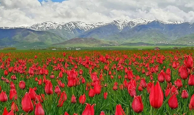 Türkiye'nin 3'üncü büyük ovasına sahip Muş'ta açan kırmızı mızraksı yapıya sahip laleler, seyrine doyumsuz manzaralar oluşturdu.