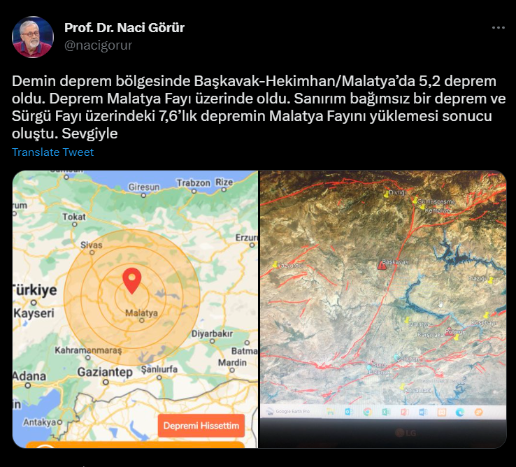 Prof. Dr. Naci Görür, Malatya'nın Hekimhan ilçesinde dün saat 19.29’da meydana gelen 5,1 büyüklüğündeki depreme ilişkin bir paylaşım yaptı. Prof. Dr. Görür, Twitter hesabından yaptığı paylaşımında, depremin 5,2 büyüklüğünde olduğunu belirterek “Deprem Malatya Fayı üzerinde oldu. Sanırım bağımsız bir deprem ve Sürgü Fayı üzerindeki 7,6’lık depremin Malatya Fayını yüklemesi sonucu oluştu” ifadelerini kullandı.