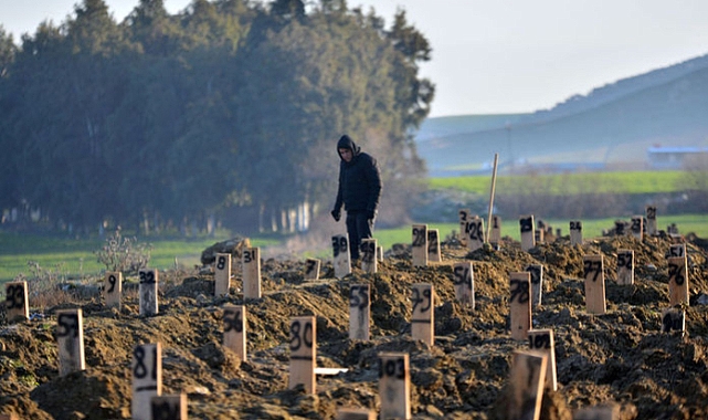 Hastanede otopsi işlemi tamamlanan cenazeler, nakil araçları ile 'deprem mezarlığı' alanına getirilip dini vecibeler yerine getirilerek defin yapılıyor.DUALARLA TOPRAĞA VERİLİYORLAR