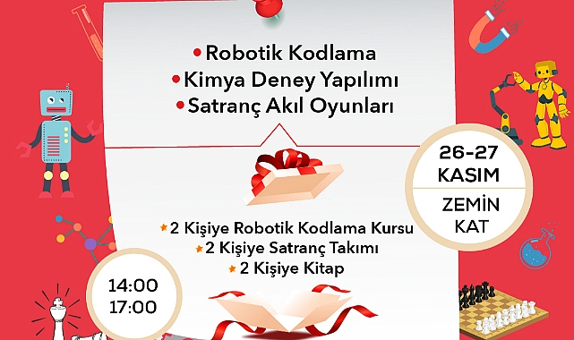 Robotik Kodlama, Kimya Deney Yapılımı ve Satranç Akıl Oyunları Sur Yapı Metrogarden AVM’den hediyeli atölyeler Sur Yapı Metrogarden’ın Bil Koleji iş birliğiyle, 3-18 yaş arası çocuk ve gençlere yönelik olarak 26-27 Kasım’da düzenleyeceği Robotik Kodlama, Kimya Deney Yapılımı ve Satranç Akıl Oyunları atölyelerine katılan 2 kişi robotik kodlama kursu, 2 kişi satranç takımı, 2 kişi kitap kazanacak. Ümraniye, Sancaktepe ve Çekmeköy’ün odak noktasında bulunan, Üsküdar – Çekmeköy metro hattıyla kolaylıkla ulaşılan Sur Yapı Metrogarden AVM’nin Bil Koleji iş birliğiyle düzenlediği Robotik Kodlama, Kimya Deney Yapılımı ve Satranç Akıl Oyunları atölyelerine katılan gençler ve çocuklar, bilgi ve becerilerini artırırken hediyeler kazanacak. Katılım ücretsiz26 Kasım ve 27 Kasım tarihlerinde, 14.00-17.00 saatleri arasında Sur Yapı Metrogarden AVM’nin zemin katındaki etkinlik alanında gerçekleştirilecek olan atölyelere katılım, rezervasyon yaptırmak koşuluyla ücretsiz olacak. 3-18 yaş arasındaki çocuk ve gençlerin katılabileceği atölyeler tamamlandığında yapılacak çekilişle 2 katılımcı robotik kodlama kursu, 2 katılımcı satranç takımı, 2 katılımcı kitap kazanacak.