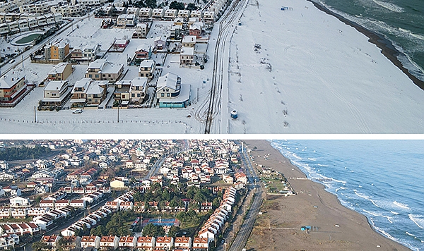 Ülkenin en uzun kumsal plajları arasında yer alan 16 kilometrelik sahilde geçen sene oluşan karla kaplı görüntüler, bu yıl kuraklık nedeniyle gözlenemedi.