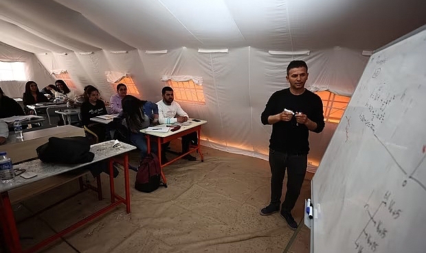 Samandağ'da depremzede gönüllü öğretmenler çadır sınıflarda gençleri sınava hazırlıyor