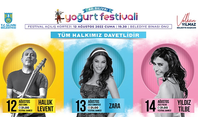SİLİVRİ’DE YOĞURT FESTİVALİ COŞKUSU BAŞLIYORSilivri Belediyesi tarafından düzenlenecek 60. Yoğurt Festivali, 12 Ağustos 2022 Cuma günü saat 19.30’da yapılacak açılış korteji ile başlıyor. 3 gün sürecek festivalde çeşitli gösteriler, şenlikler, sinema gösterimleri, sergiler, halk dansları gösterileri, ödüllü turnuva ve yarışmalar düzenlenirken; ünlü sanatçılar Haluk Levent, Zara ve Yıldız Tilbe en güzel şarkılarıyla Silivrililerle buluşacak.