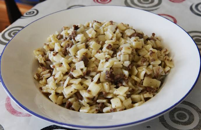 Lokum pilavı tuzlu suda haşlanır.250 gram kıyma 100gr tereyağı içinde kavrulur.İcerisine Tuz,karabiber ve zeytinyağı eklenir.Suyu süzülen makarnanın üzerine eklenir.Afiyet olsun