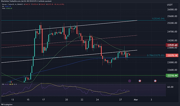 Şubat ayını geride bırakırken bu ayın kazananı kripto paralar, kaybedenleri ise altın ve hisse senedi piyasaları oldu. Bitcoin 23.000$ üzerinde kalma çabasını sürdürüyor ve bugün 23.375$ seviyelerinde fiyatlanıyor. Ethereum da önemli bir desteğin üzerinde 1.628$ seviyelerinde fiyatlanıyor. Ethereum, Bitcoin’e nazaran daha iyi bir performans göstermeye devam ediyor.Dün ABD’den gelen Dayanıklı Mal Siparişleri (aylık) verisinin beklentinin üstünde gelmesiyle Bitcoin’de yakaladığı yükseliş kalıcı olmadı, Coinbase’in Binance USD (BUSD) alım-satım işlemlerini durduracağı yönündeki açıklama ile geri çekilme görüldü.Bitcoin dominansı 43,90 seviyesinde geri çekilmeler mevcut. Ethereum dominansı ise 19,4 ile yükselişte. Bugün piyasaları etkileyecek bir haber akışı olmamakla birlikte kriptoların kendi iç dinamiklerindeki haber akışları önemli olacaktır.Gün itibariyle vadeli endekslerde yatay negatif seyir gözlemleniyor. Kripto para piyasasının toplam piyasa değeri 1,02 trilyon dolar seviyelerinde geri çekilmeler mevcut. Bugün Bitay’da günün en çok yükselenleri ise TRU, DOCK, SNX ve AGLD olarak öne çıkıyor. BITCOIN TEKNİK ANALİZ