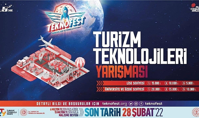 Turizmde En Son Teknolojiler TEKNOFEST’te YarışıyorDünyanın en büyük Havacılık, Uzay ve Teknoloji Festivali TEKNOFEST’te Türkiye’nin en büyük para ödüllü teknoloji yarışmalarına başvurular devam ediyor. Bu yıl 41 ana yarışma-102 farklı kategoride düzenlenen yarışmalardan biri olan Turizm Teknolojileri Yarışmasında da turizm alanında fark yaratacak, yeni fikirlerin çıkış noktası olacak projeler mücadele ediyor. T.C. Kültür ve Turizm Bakanlığı yürütücülüğünde düzenlenen Turizm Teknolojileri Yarışmasında katılımcıların zengin kültür, turizm imkanlarını ve faaliyetlerini akıllı, yenilikçi bilgi teknolojilerinden faydalanarak tanıtacakları birbirinden değerli çalışmalar yarışıyor. Projeler turizm sektörüne yüksek katma değer sağlayacakTurizm Teknolojileri Yarışması kapsamında, yarışmacı adaylarından turizm ve kültür alanlarında teknoloji entegrasyonu ile öğrenilmesini, tanıtımını veya sahip olunan değerlerin farkındalığının artırılmasını, bu alanlarda kullanılan yöntem ve metodların geliştirilmesini sağlayacak ürünler hazırlamaları bekleniyor. Yarışmaya mobil yazılımlar, web yazılımları, prototip, eğitsel oyun, eğitsel simülasyon gibi yazılım odaklı projeler kabul edilirken altı farklı tema sunuluyor. Yenilikçi kültürel tanıtım, yenilikçi turizm tanıtım, güvenli ve akıllı otelcilik, dijital kültür-turizm oyunları, arttırılmış gerçeklik ile desteklenmiş oyunlaştırma kurgusu ve turizm asistanından oluşan temalarla hazırlanacak projelerin turizm sektörümüze katma değer sağlaması hedefleniyor. Başvuruların 30 Kasım 2022 tarihine kadar devam ettiği, Türkiye ve yurt dışında öğrenim gören, lise, üniversite, yüksek lisans ve doktora öğrencilerinin katılabildiği yarışmada takımlar maksimum 8 kişiden oluşabiliyor. Lise ve üniversite öğrencilerinin iki ayrı kategoride değerlendirildiği Turizm Teknolojileri Yarışmasında lise seviyesinde birincilik ödülü 30.000 TL, ikincilik ödülü 20.000 TL, üçüncülük ödülü ise 10.000 TL’lik para ödülünden oluşuyor. Üniversite ve üzeri seviyede takımlarda da birincileri 40.000 TL, ikincileri 30.000 TL ve üçüncüleri 20.000 TL değerinde para ödülü bekliyor.Cumhuriyetimizin 100. Yılında TEKNOFEST Coşkusu Üçe KatlanıyorCumhuriyetimizin 100. yılında İzmir, Ankara ve İstanbul’da düzenlenecek TEKNOFEST coşkusunu üçe katlıyor. Her yıl bir önceki yıla göre daha fazla yarışma kategorisinin açıldığı ve Türkiye tarihinin en büyük ödüllü teknoloji yarışmaları olan TEKNOFEST teknoloji yarışmaları 2023’te 41 ana yarışma 102 alt kategoride düzenleniyor. Festival coşkusunu Türkiye’nin dört bir yanına taşıyan, ayakları yere basmayan tek festival TEKNOFEST’te yarışmalara katılmak için başvurular www.teknofest.org web sitesi üzerinden yapılacak.