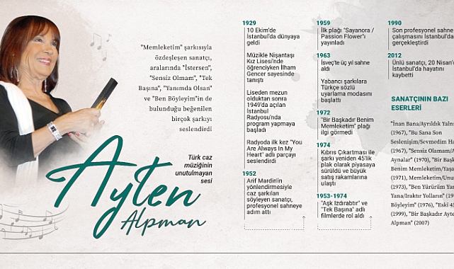 "Memleketim", "Anlamazdın", "Ben Böyleyim" ve "Ben Varım" adlı eserlerle hatırlanan caz sanatçısı Ayten Alpman vefatının 11. yılında yad ediliyor.
